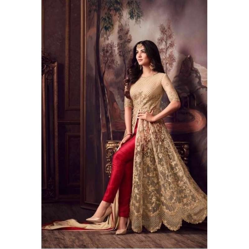 Stunning new designer anarkali style dress in net. This is beautifully crafted with zari,zarkan and hand work. This Anarkali Dress comes with matching chiffon dupatta and coming with inner and bottom