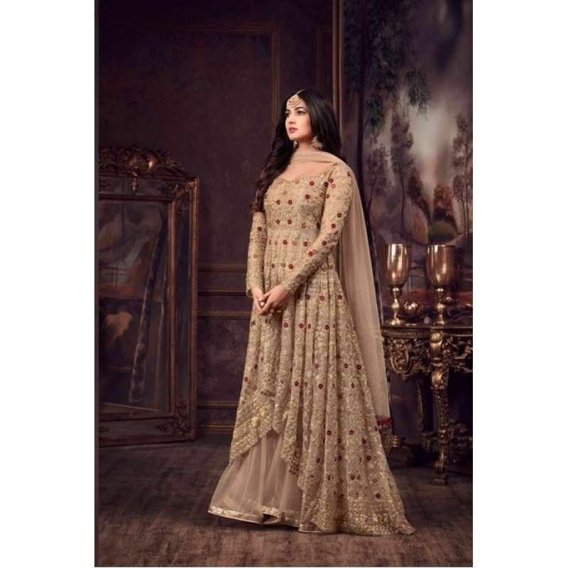 Stunning new designer anarkali style dress in net. This is beautifully crafted with zari,zarkan and hand work. This Anarkali Dress comes with matching chiffon dupatta and coming with inner and bottom