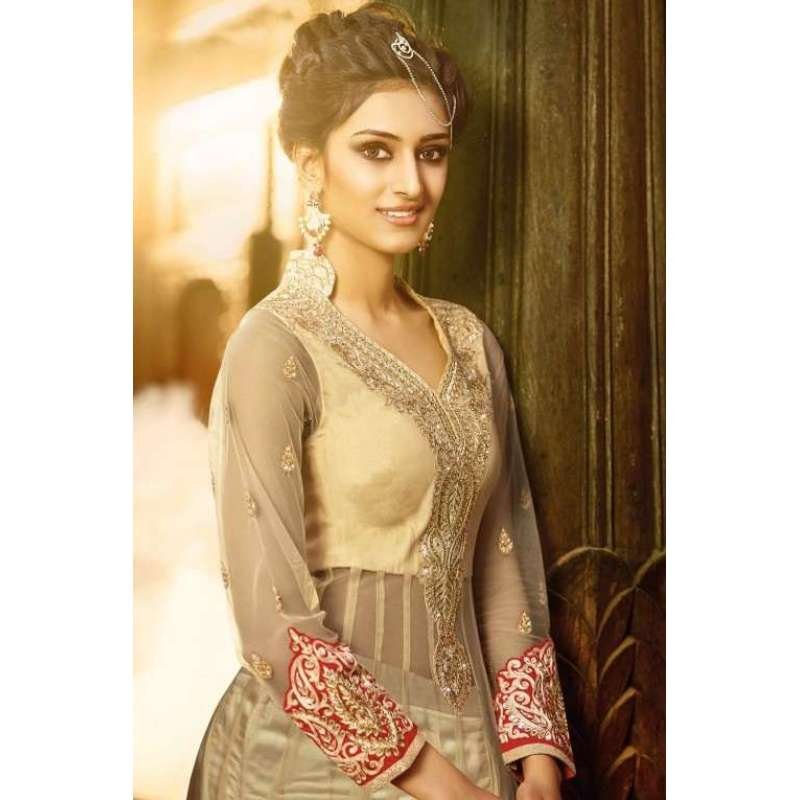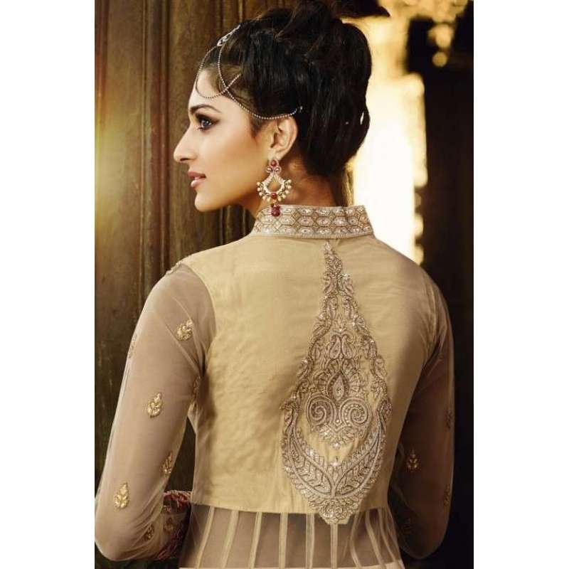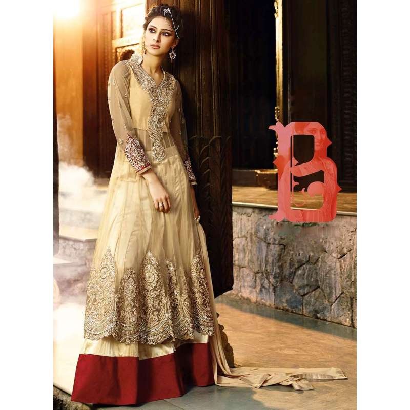 Elevate your occasion look with this Beige Wedding Party Designer Anarkali Suit. Designed in elegant Aafreen net with exquisite Zari, resham, booti, and sequin embroidery, this lehenga-style suit features intricate patch border detailing. The set includes a semi-stitched top, unstitched Japan crepe lehenga bottom, and a matching dupatta – perfect for customizing your dream outfit.