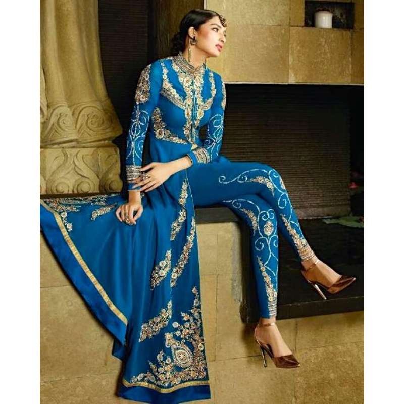 Tags: 9102, Royal blue suit, front open designer dress, embroidered salwar suit, Indian party wear, zari embroidery suit, georgette anarkali, ethnic fashion for women,