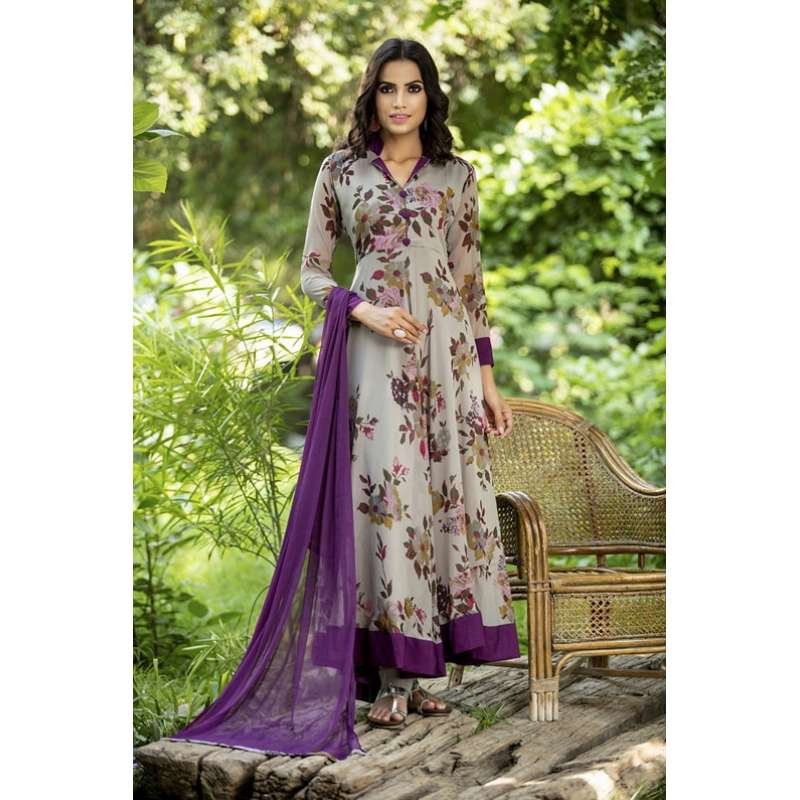 Grey Purple Chiffon Floral Printed A Line Dress Readymade