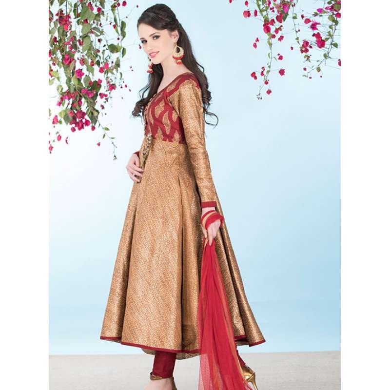 Kalidaar contrast suit with button detailing on bodide. Teamed with maroon churidaar & dupatta.