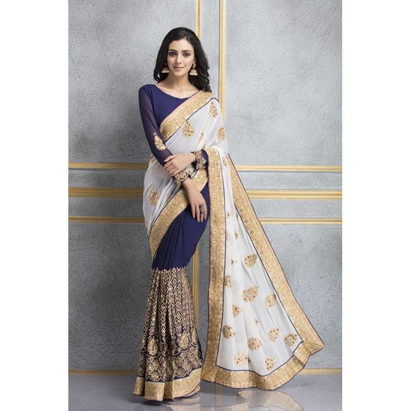 ZACS-70 WHITE AND NAVY GEORGETTE HEAVY MIRRORWORK WEDDING WEAR SAREE