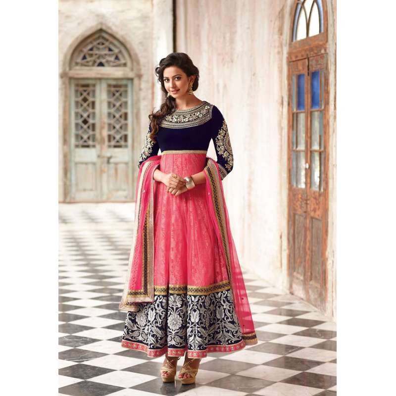 An appealing Floral designer Anarkali in Valvet and Net fabric with Heavy Thread work and Embellishments. Santoon Bottom with Net Dupatta. Give yourself stunning look with these new and unique desiner dresses to fulfill your every desire and need.
