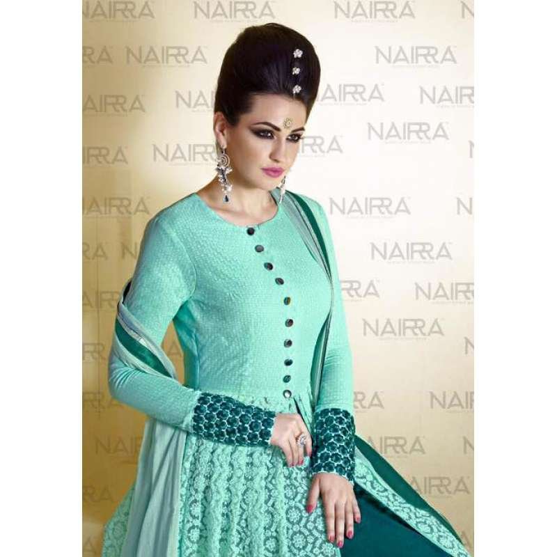 Elevate your party look with this elegant Aqua Green Slit Style Dress. Featuring a white yolk with Khadi print and detailed Shifli embroidery on premium Maharani net. The embroidered cuffs add a refined touch. Paired with a flowy Nazneen chiffon dupatta and soft shantoon bottom for a graceful finish. Ideal for festive occasions and formal gatherings.