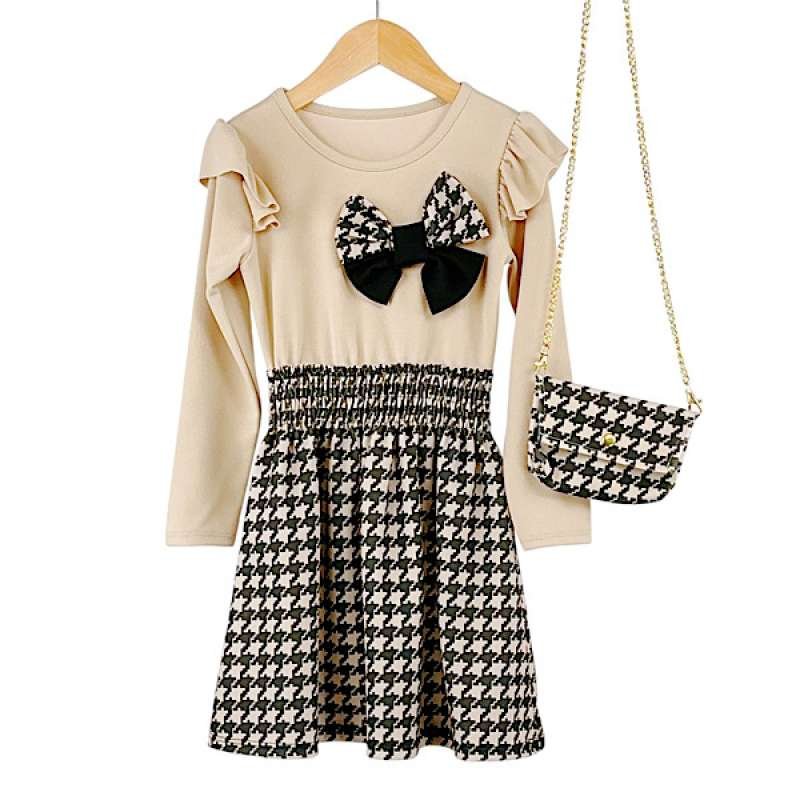 Beige Black Girls Dogtooth Bow Dress with Bag