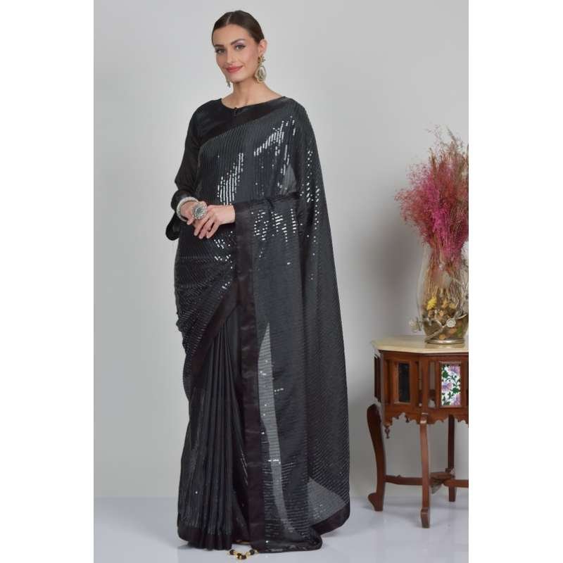 Beautiful chinnon fabric sarees with allover sequins work and edges finished with matching satin border.