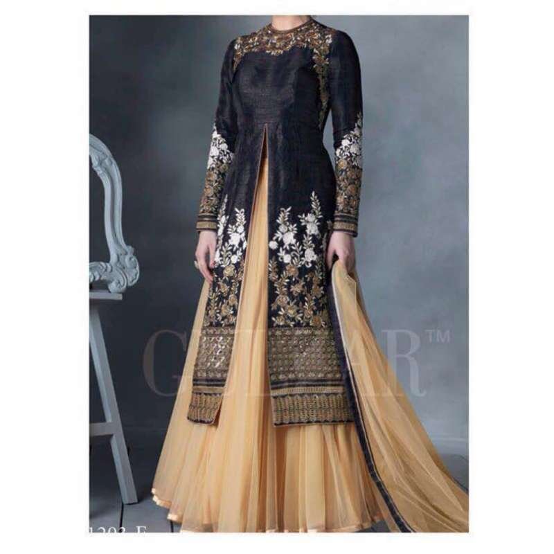 Flaunt the best of fashion with this stylish black and beige lehenga style anarkali suit. Raw Silk Shirt Fabric with Slit, lengha/trouser for bottoms and a simple net duppatta.