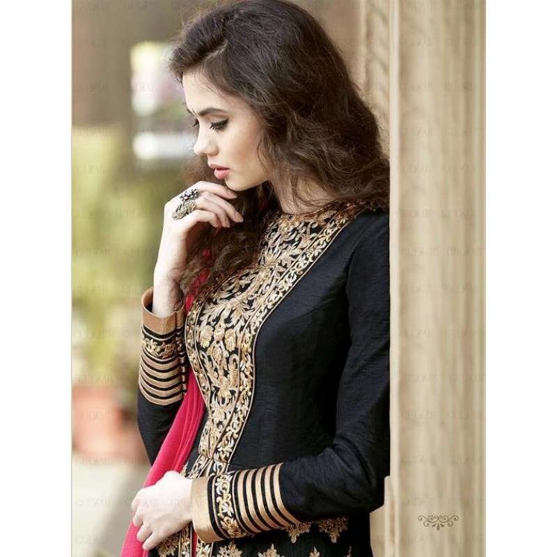 Gulzar Designer black and pink anarkali suit designed with embroidered Zari, heavy foliage patterns with patch border work.