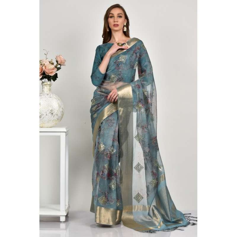 Bluish grey floral organza sraee with allover sequins embroidered butti edges designed with beautiful tissue work. It is paired with same floral organza blouse.