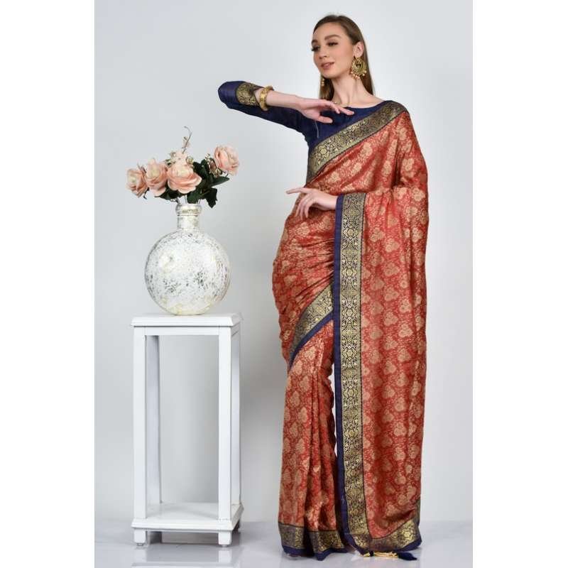 Carrot Navy Blue Brocade Style South Indian Saree