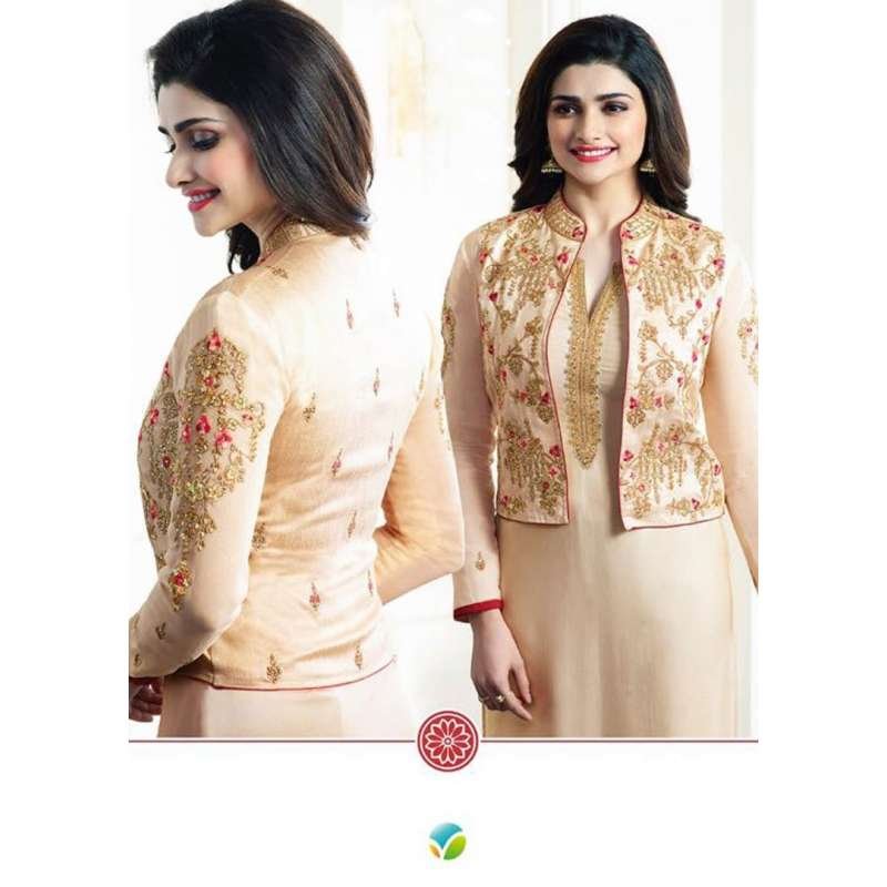 Georgette straight kameez with jacket style suit modeled by prachi desai. this dress is beautified with zari, sequins, embroidered patch work at bottom and neck of the kameez. This suit comes with matching santon material for churidar/salwar and chiffon dupatta and matching lining for kameez.