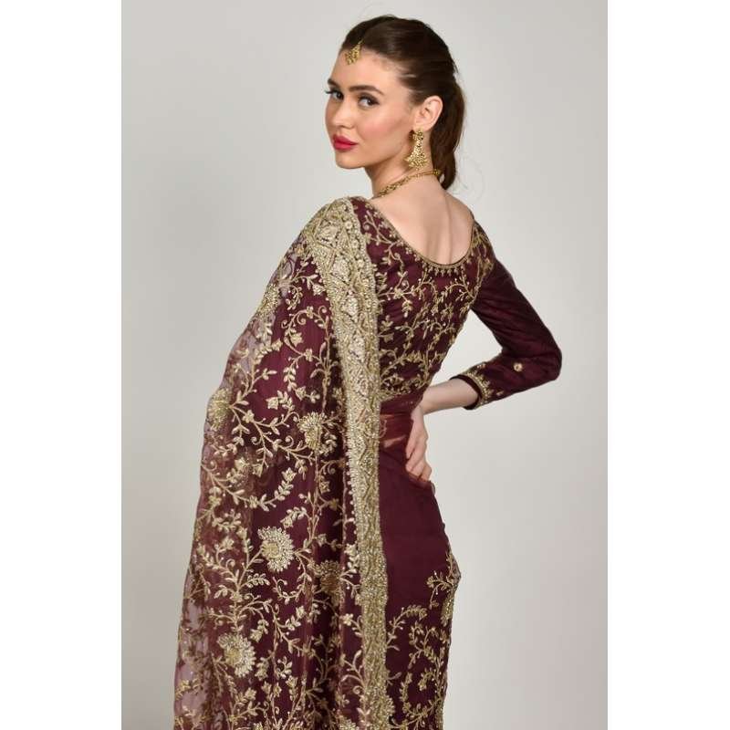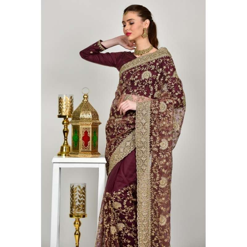 Dark Maroon Embroidered Bridal Saree