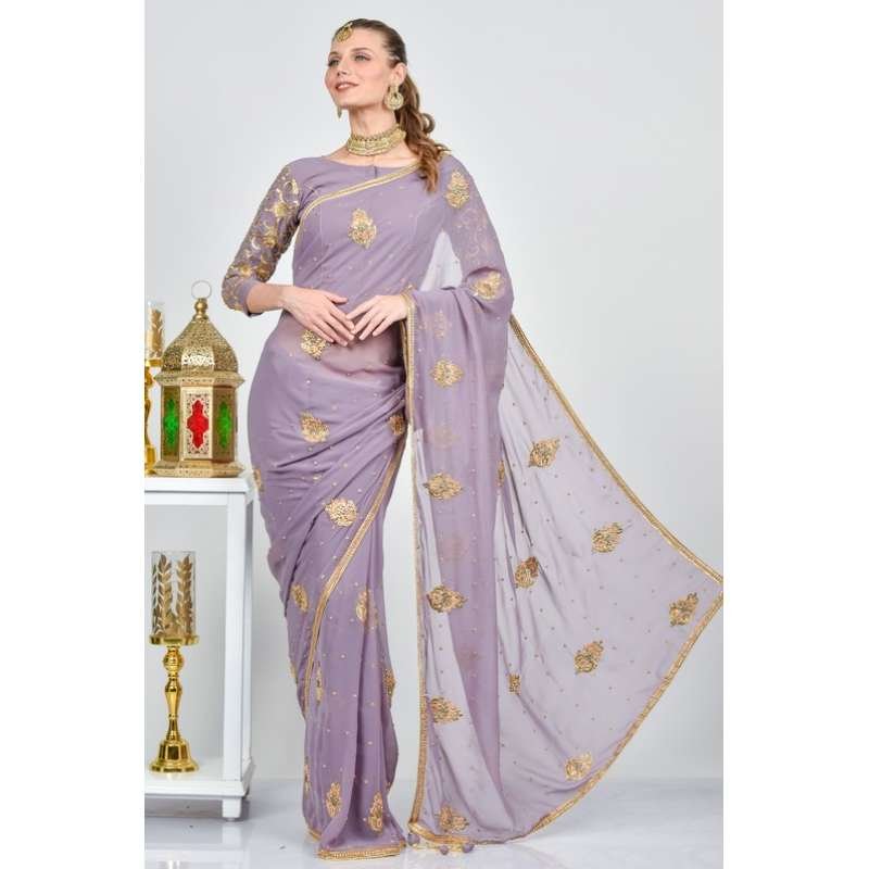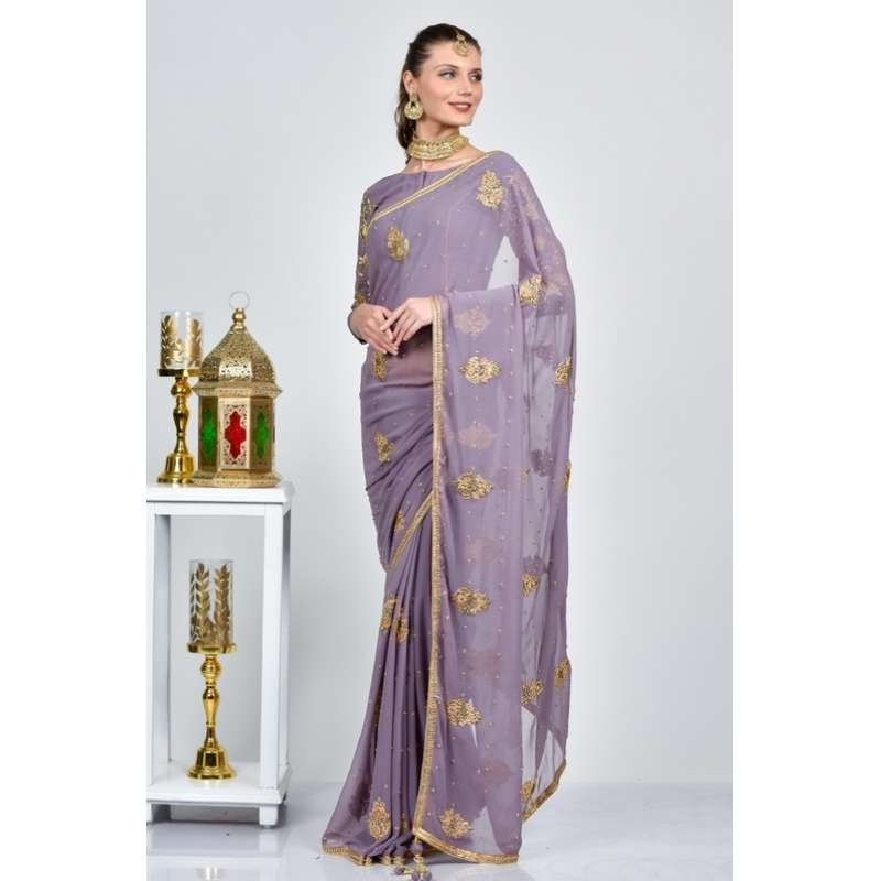 Beautiful georgette saree with allover heavy embroidered buttis and stons, Edges designed with embroidered border and piping with latkans on pallu. It is paired with same georgette blouse with piping on neckline and princeline, heavy border on sleeves.