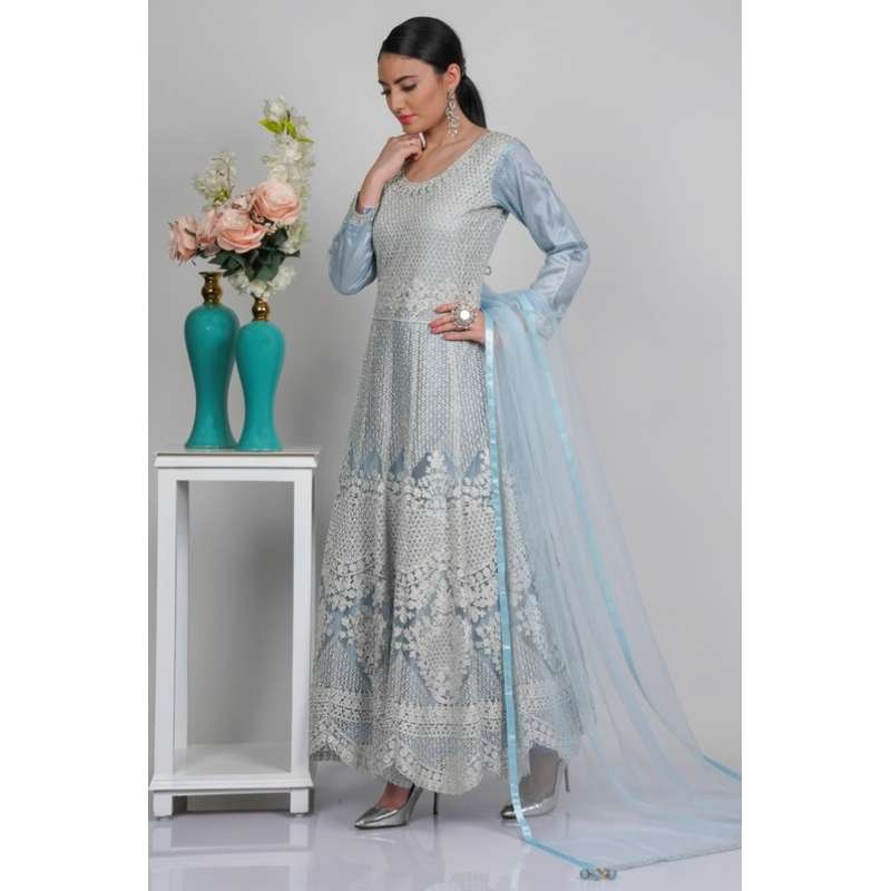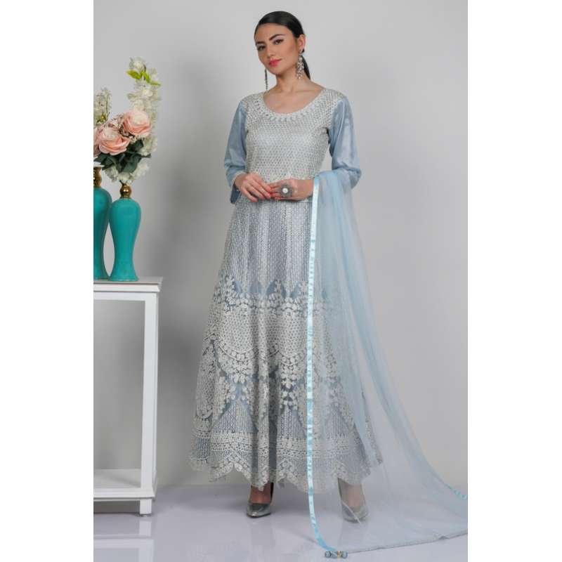 Dusty Blue Net Embroidered Anarkali Dress