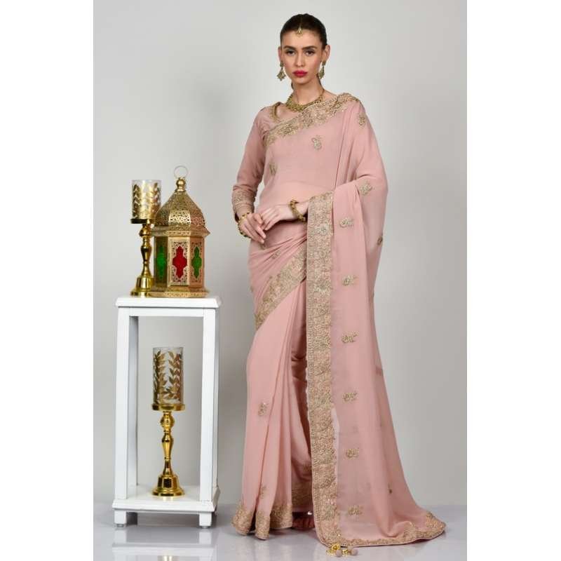 Beautiful georgette fabric saree with allover gold embroidered butti, edges designed with heavy embroidered gold border and latkans on pallu. It is paired with same color embroidered blouse.