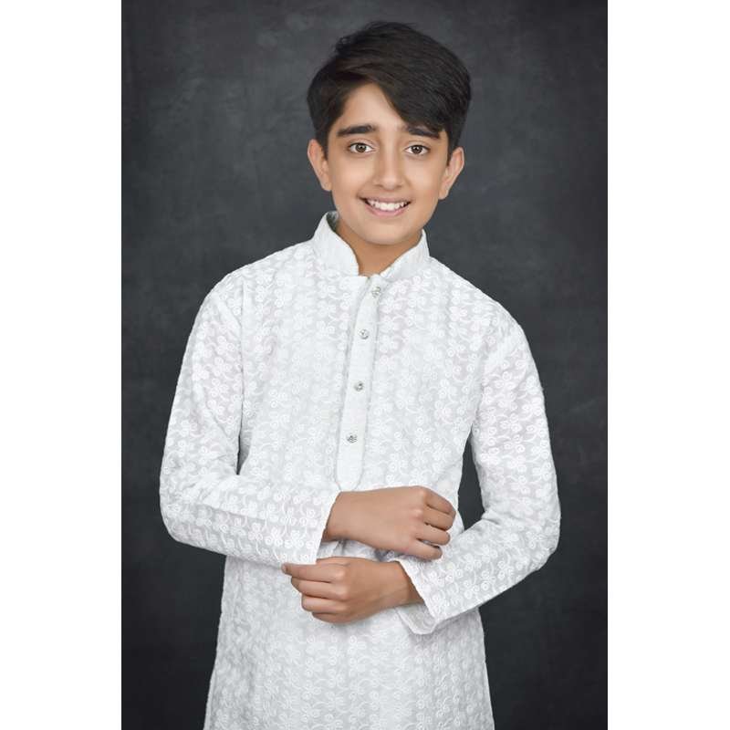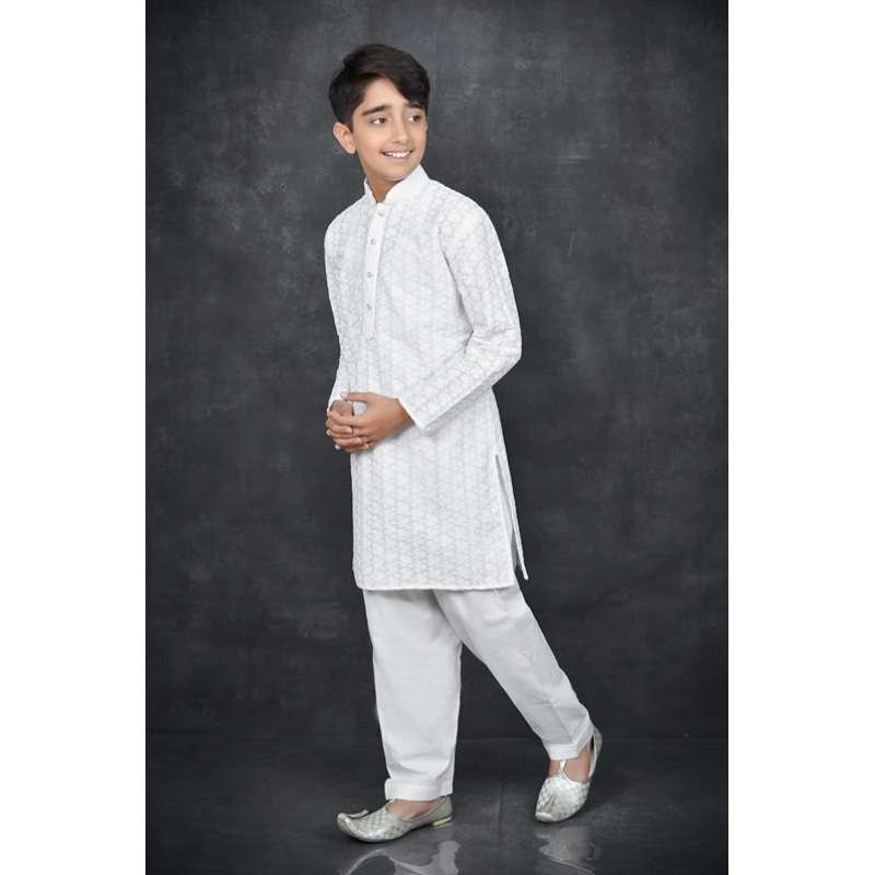 A classic chikenkari Boys kurta with simple buttons and plain salwar.