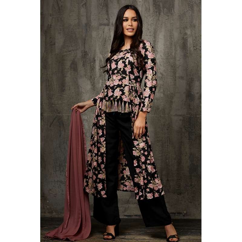 Black Floral Shirt & Trouser Readymade Jacket Style Pakistani Dress