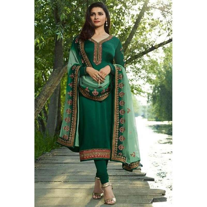 Straight cut churidaar kameez Prachi Desai in Georgette Fabric  This outfit stylishly crafted by Embroidery, Zari, Zarkan with Hand work to keep you comfortable throughout the day . This outfit comes with matching embroideryt  Dupatta, Sleeves, shantoon Inner and shiffly Bottom.