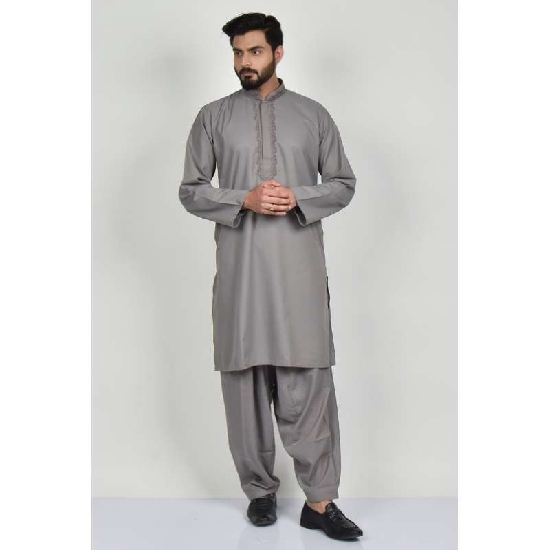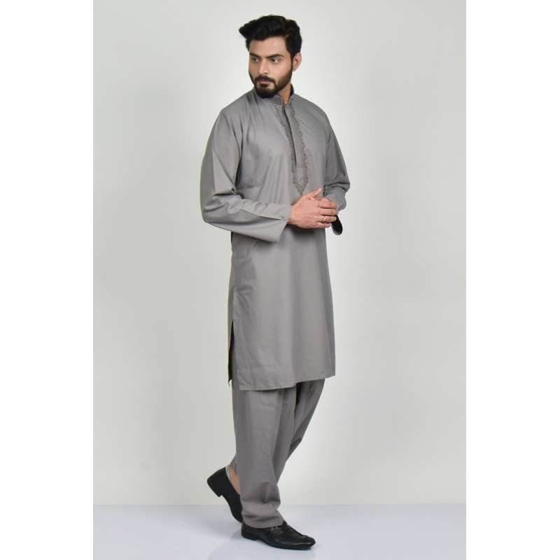 Beautiful grey color ban neck embroidered kurta with matching salwar.