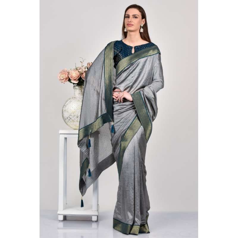 Grey Teal Blue Stitched Blouse Party Saree