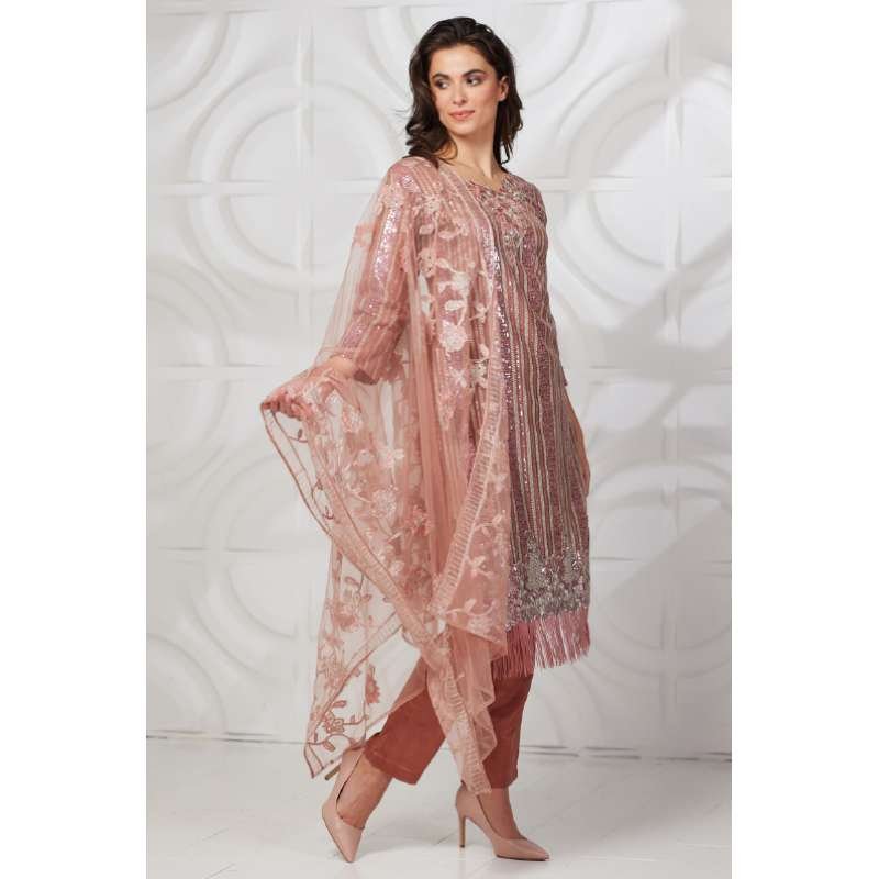Beautiful sequins embroiderered kurti with matching trouser, It is paired with self embroidred net dupatta with four side latkans.