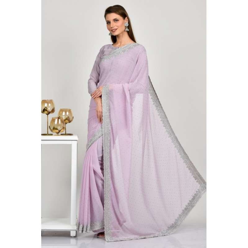 Beautiful saree allover stone work edges designed with pearl lace. It is paired with allover sequins blouse.
