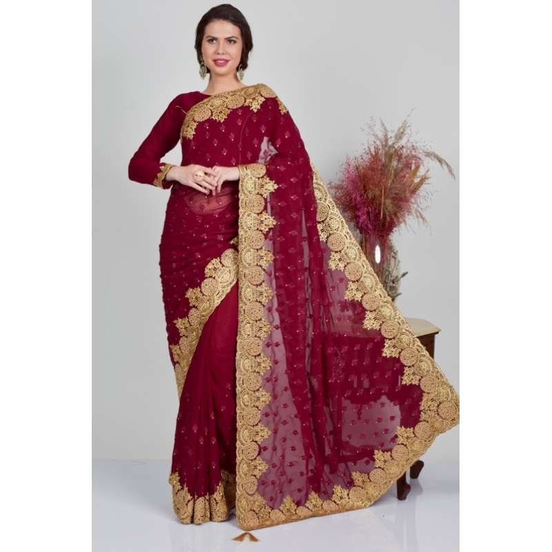 Fashionable georgette fabric saree with allover self embroidery with stone work and edges designed with heavy gold embroidery work with half bedding work.