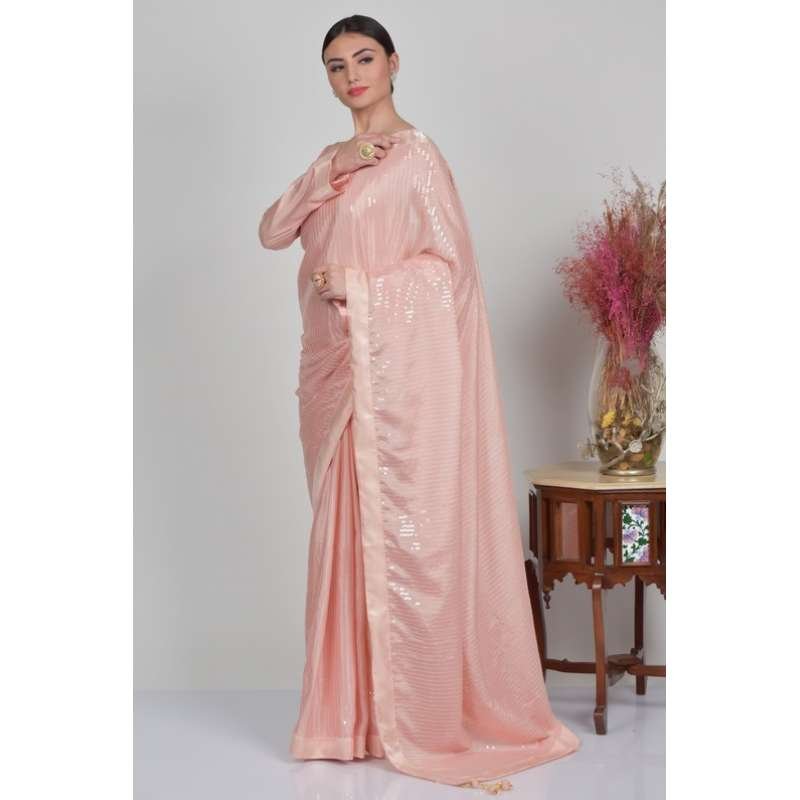 Beautiful chinnon fabric sarees with allover sequins work and edges finished with matching satin border.
