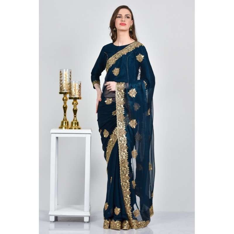 Shimmer saree with allover stone work edges designed with heavy gold embroidery. This saree comes with same color blouse, piping on neckline and border on sleeves.