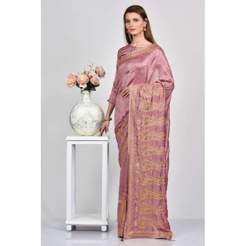 Vachitra fabric saree with allover heavy gold embroidery, edges designed with gold border. It is paired with same color blouse with border on sleeves.