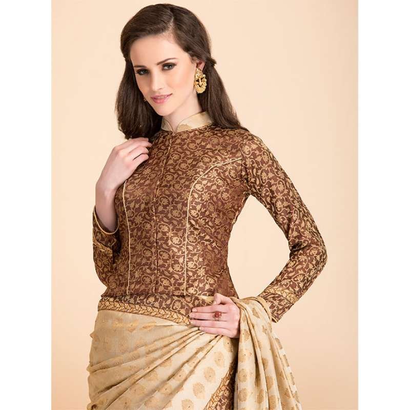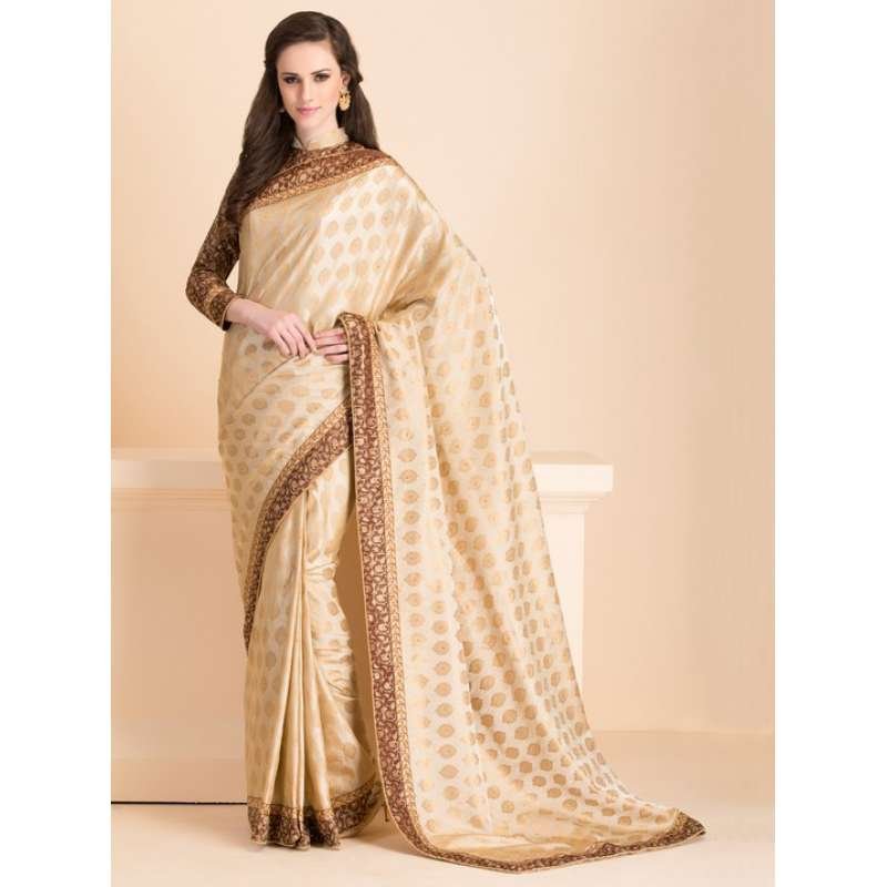 A subtle beige saree with embossed gold motifs and a contrast border teamed with a jacket style full sleeve blouse.Polyester / Ready Stitched Blouse|Size - 40 Jacket Style Blouse