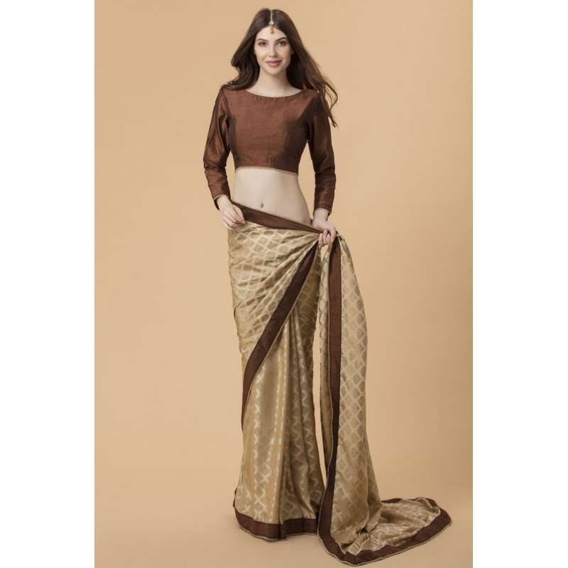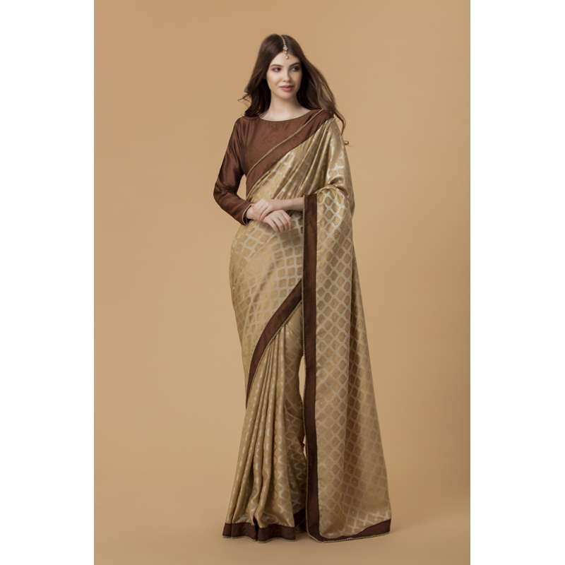 - The saree has a border of dark chocolate brown colour with pearl detailing