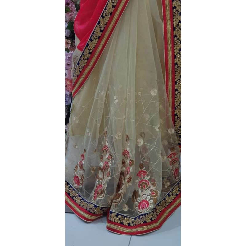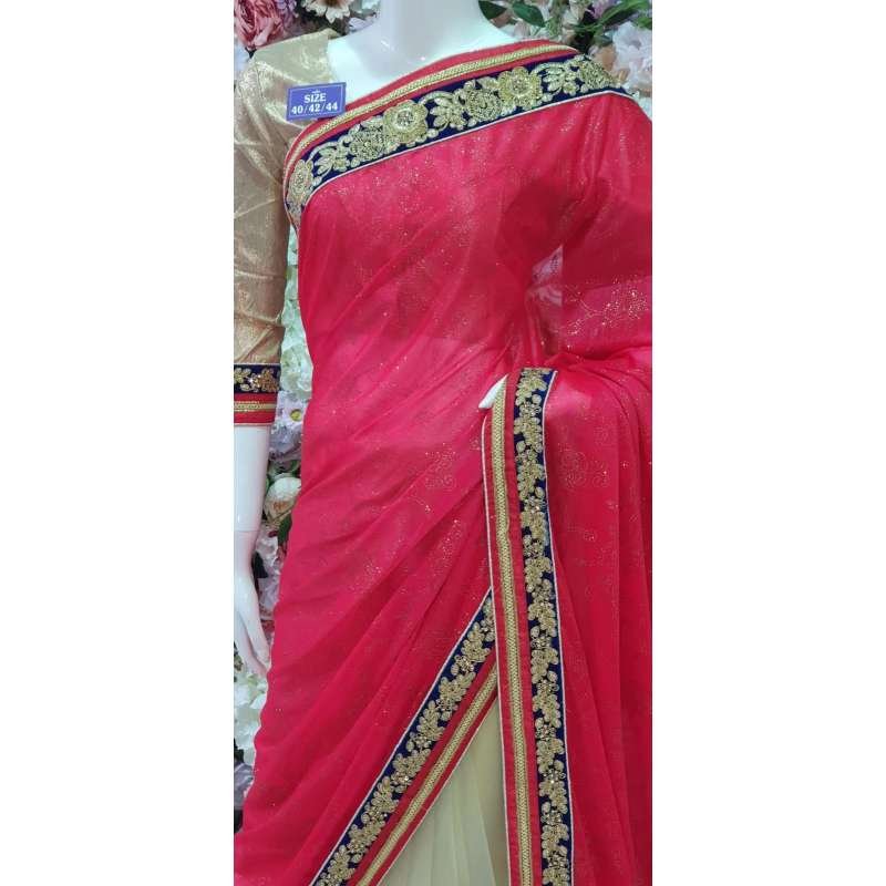 PALOO HALF SHIMMER GEORGETTE FABRIC WITH GOLD PRINT ALL OVER. CONTRAST COLOUR EMBROIDERY BORDER. PLEAT (BOTTOM) HALF IN CONTRAST COLOUR NETT FABRIC WITH SELF & CONTRAST COLOUR RESHAM EMBROIDERY. READYMADE LONG SLEEVES BLOUSE WITH EMBROIDERY BORDER WRIST.