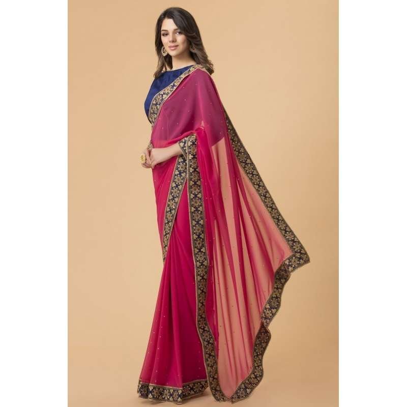 - Stunning bright saree in georgette with unique floral threadwork border on it