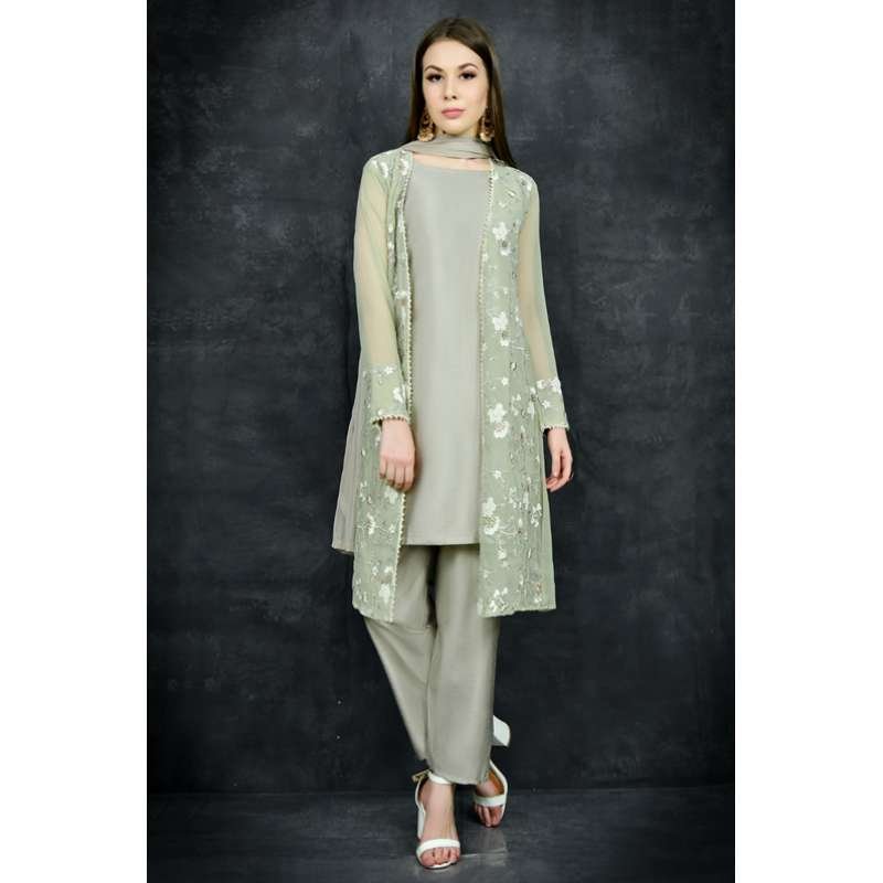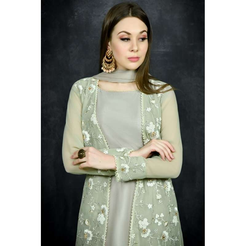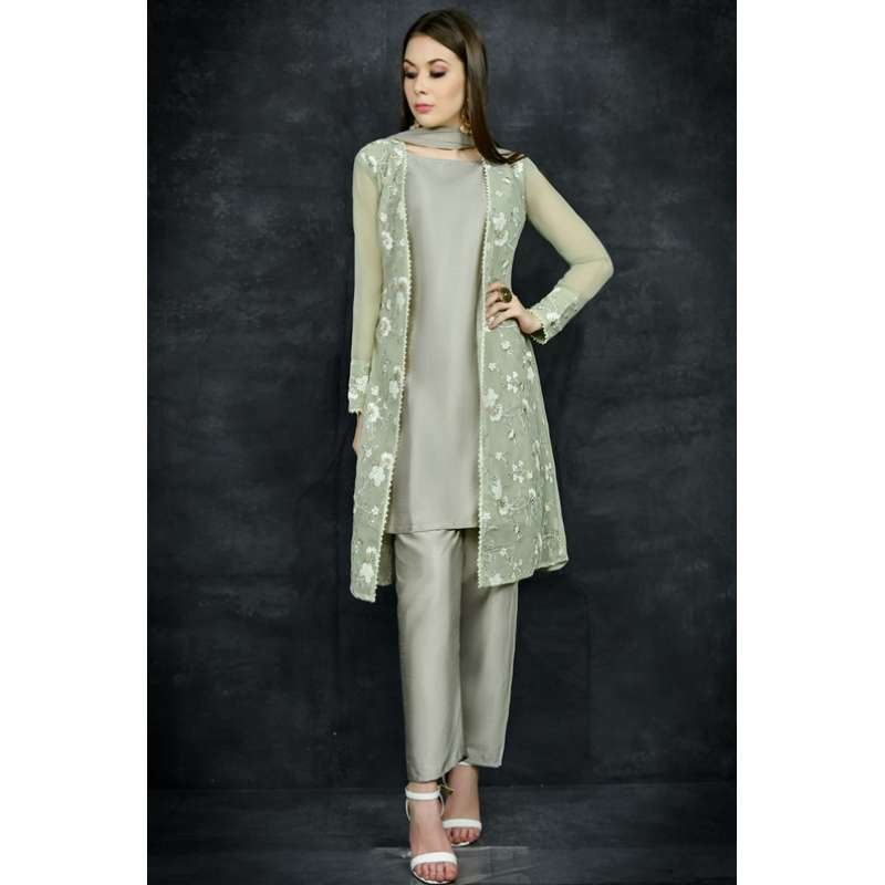 Jacket stye dress with embroidered front and embellished with pearl lace paired with matching inner, capri & dupatta.