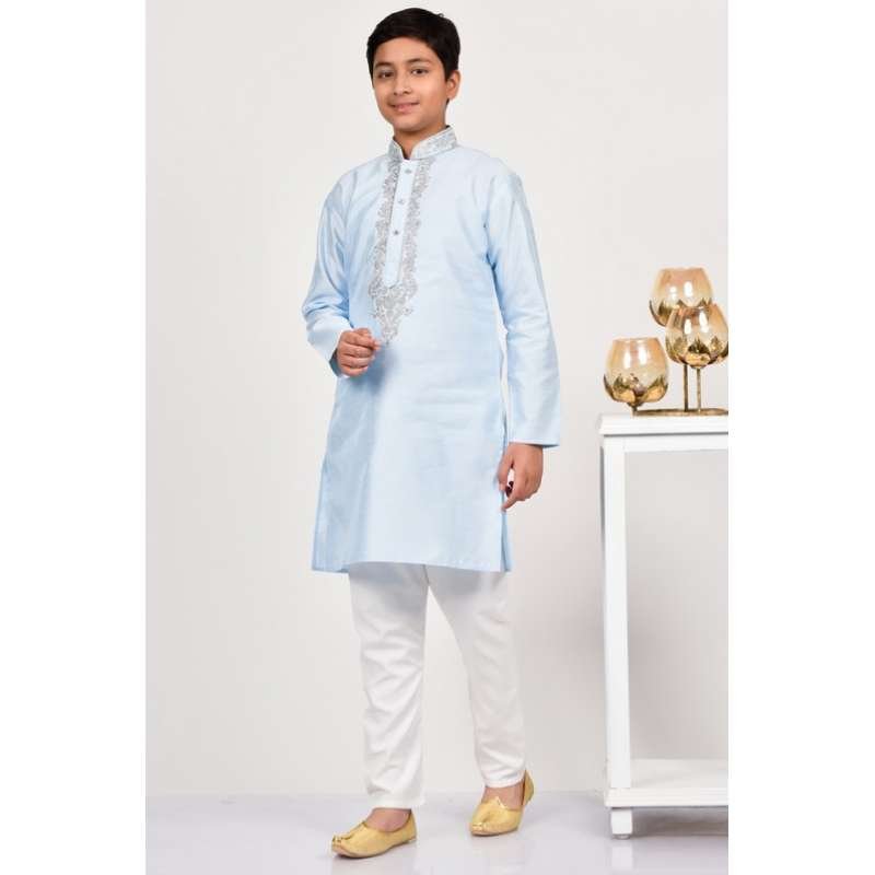 Light Blue Embroidered Kurta White Pajama Boys Suit