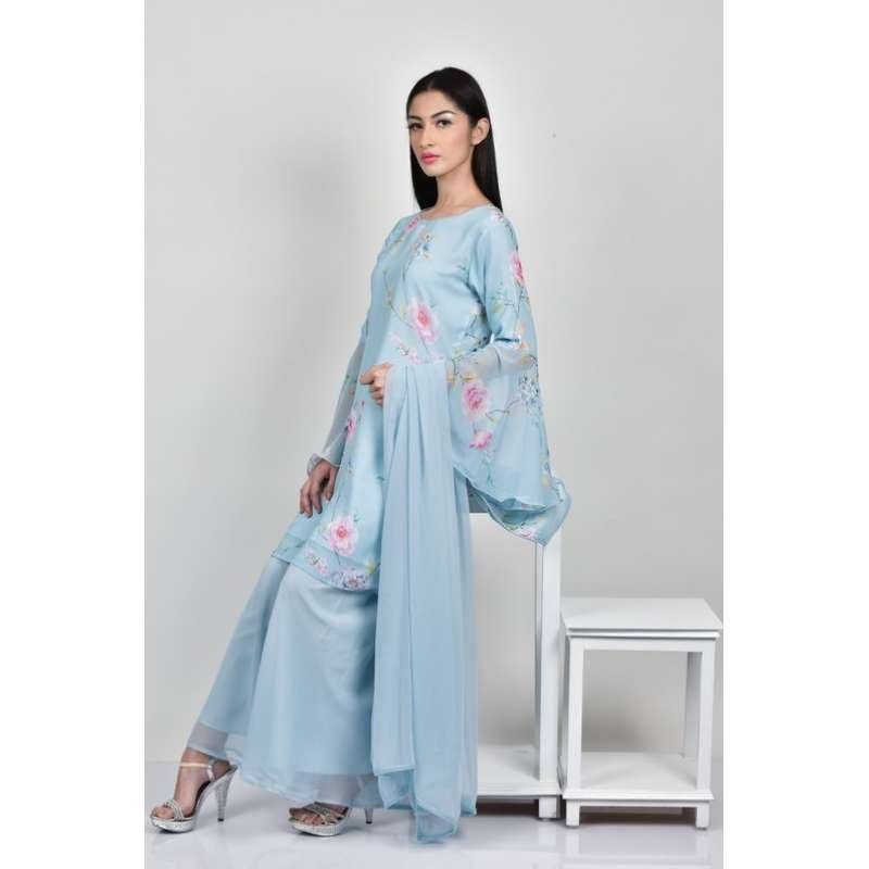 The beautiful printed light blue color slit cut kurti with bell sleeves. It is paired with a matching georgette sharara with plain dupatta.
