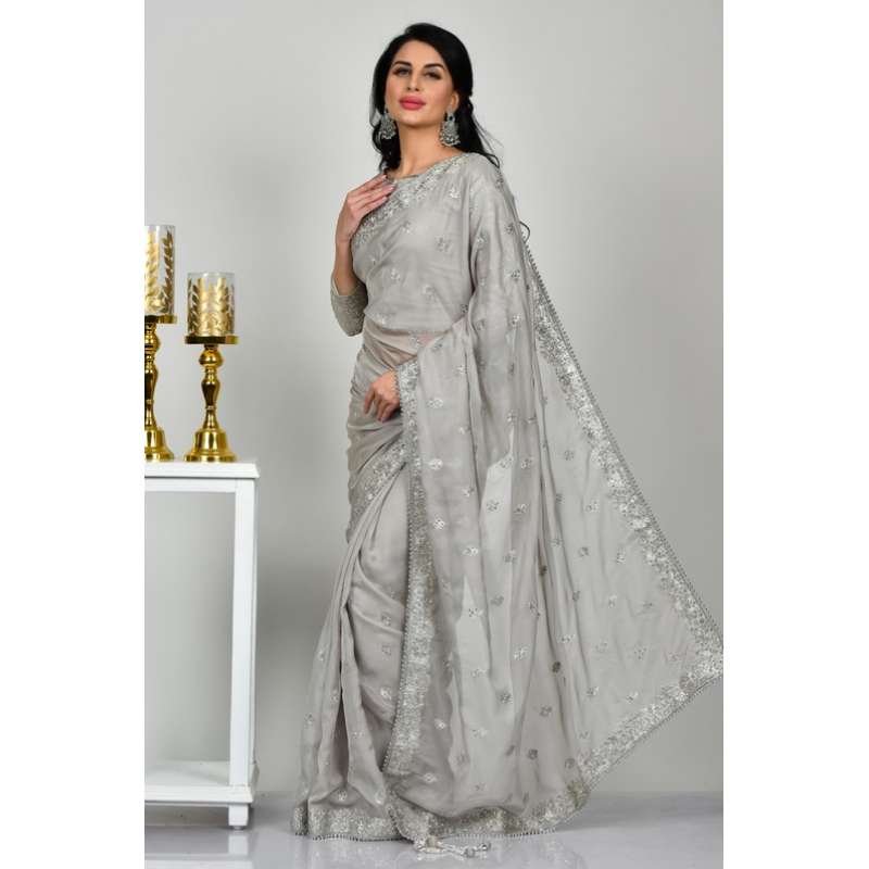 This beautiful organza saree with allover silver butti, edges designed with heavy silver border with silver pearl lace. It is paired with same color blouse with pearl lace on neckline and heavy embroidery on sleeves.