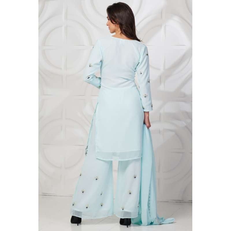 Beautiful georgette L. Sky color kurti with contrast embroidery. It is paired with embroidered palazzo and plain georgette dupatta with one side contrast embroiery and 3 side silver lace.