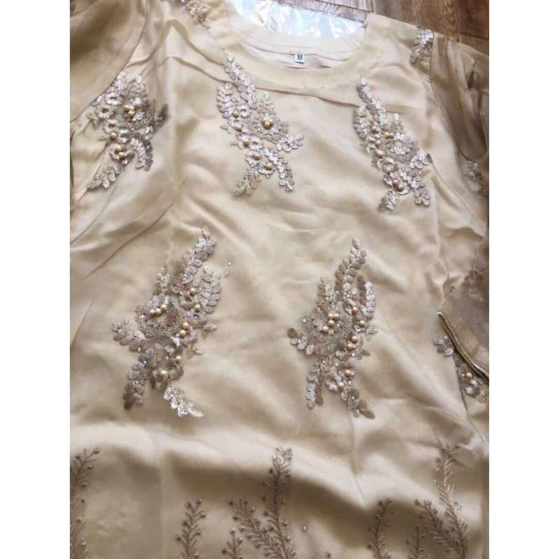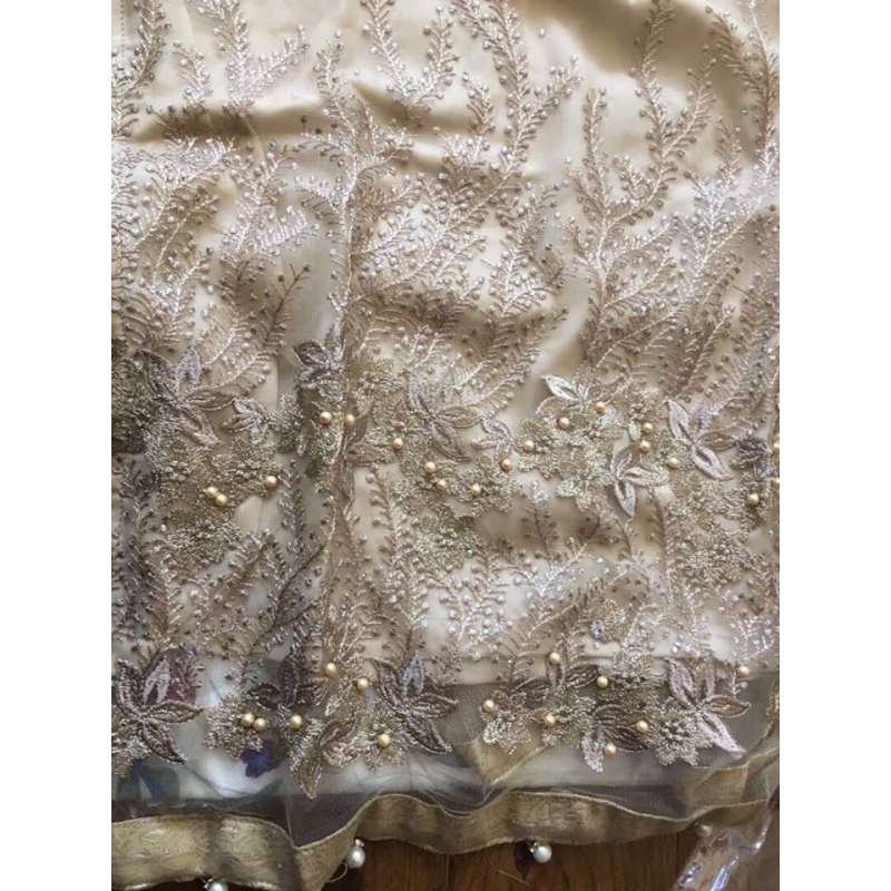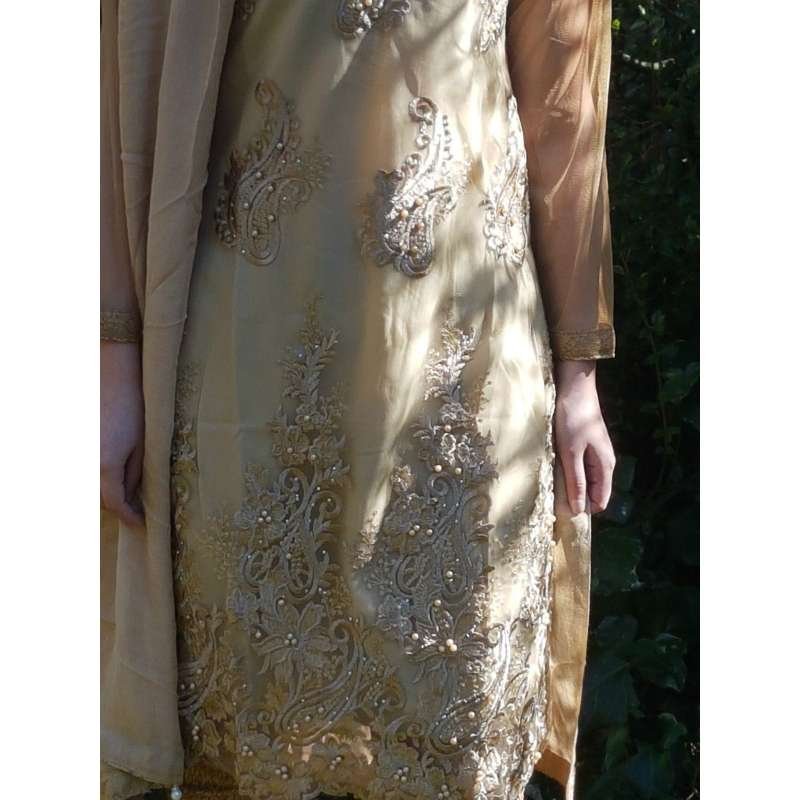 -39% LUXURY BEIGE GOLD PEARL EID DESIGNER READY MADE SUIT