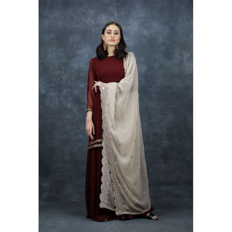 A gorgeous maroon garara paired with a short kurti embellished with nalki lace on hemline and arms is paired with a contrasting georgette dupatta with scalloping and zari work, enhancing it to give a perfect look.