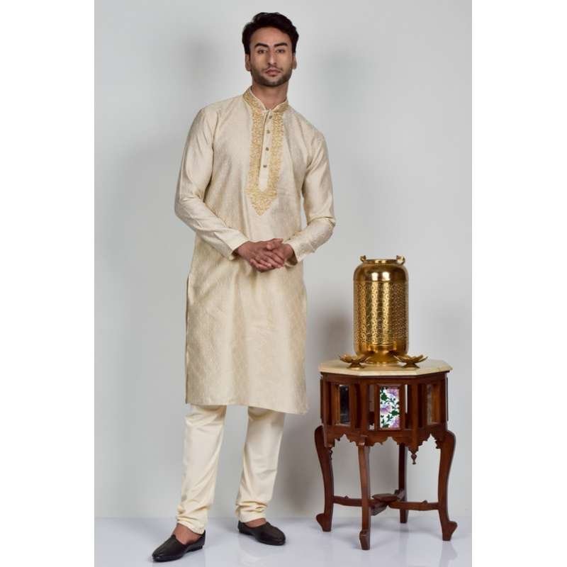 A gold colored royal kurta with embroidery on neckline with gold buttons, paired with contrast pyjama