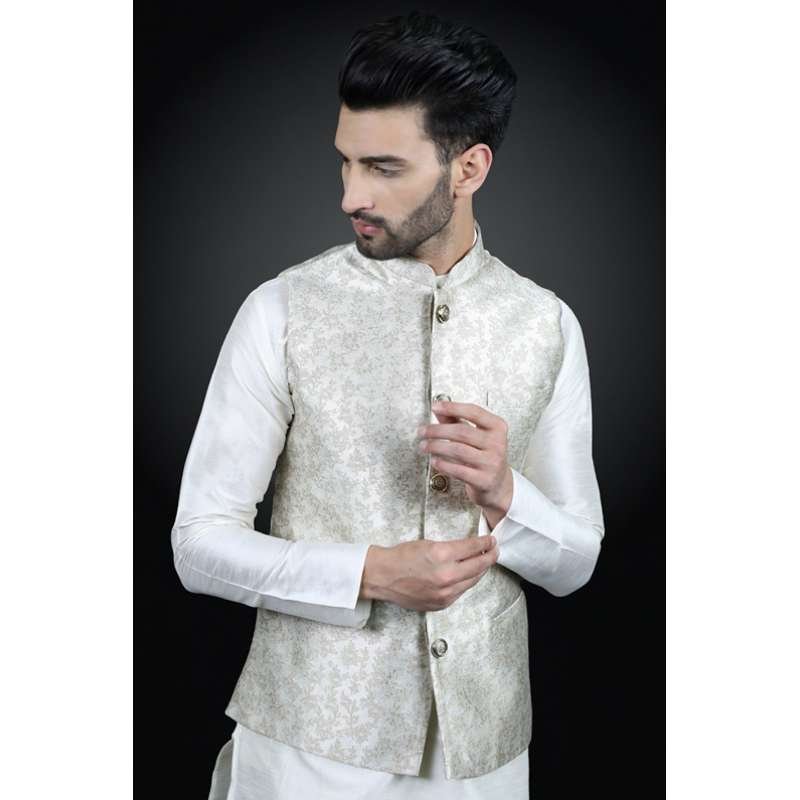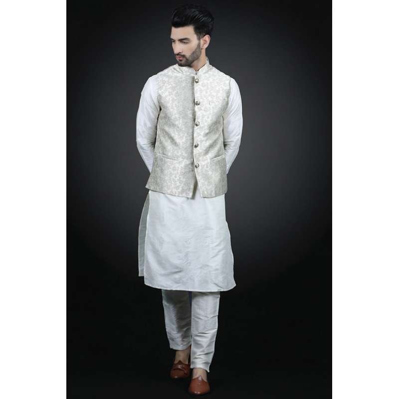 A white kurta pyjama set with a silver embroidered waist coat featuring round silver buttons will complete your look with style and royalty.