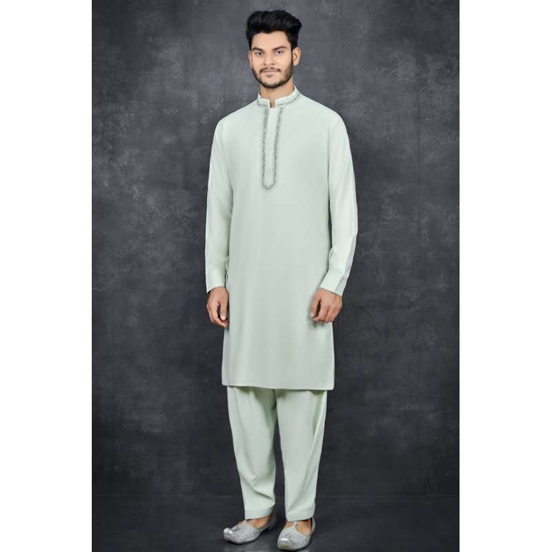 An elegant set of kurta salwar with intricate embroidery along the neckline.