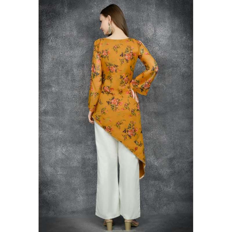 This fashionable piece in vibrant yellow color is a must-have due to its trendy hemline and the slits in its sleeves. The alluring floral print with bead detailing on the hemline and the sleeves is tailored keeping movement and comfort in mind. It is paired with a chiffon dupatta and trousers.