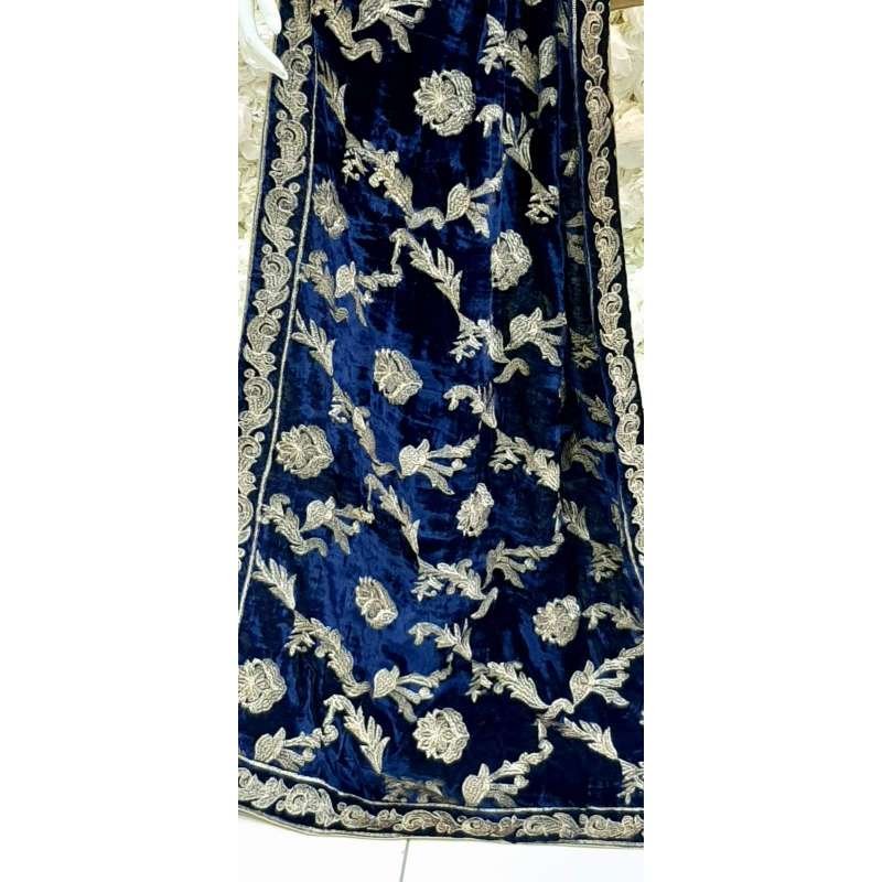 DARK NAVY VELVET SHAWL WITH HEAVY ANTIQUE ZARI CRISS CROSS STYLE JAAL EMBROIDERY ALL OVER. ANTIQUE ZARI EMBROIDERY BORDER ON ALL 4 SIDES. CONTRAST MATCHING PIPING ON ALL EDGES.