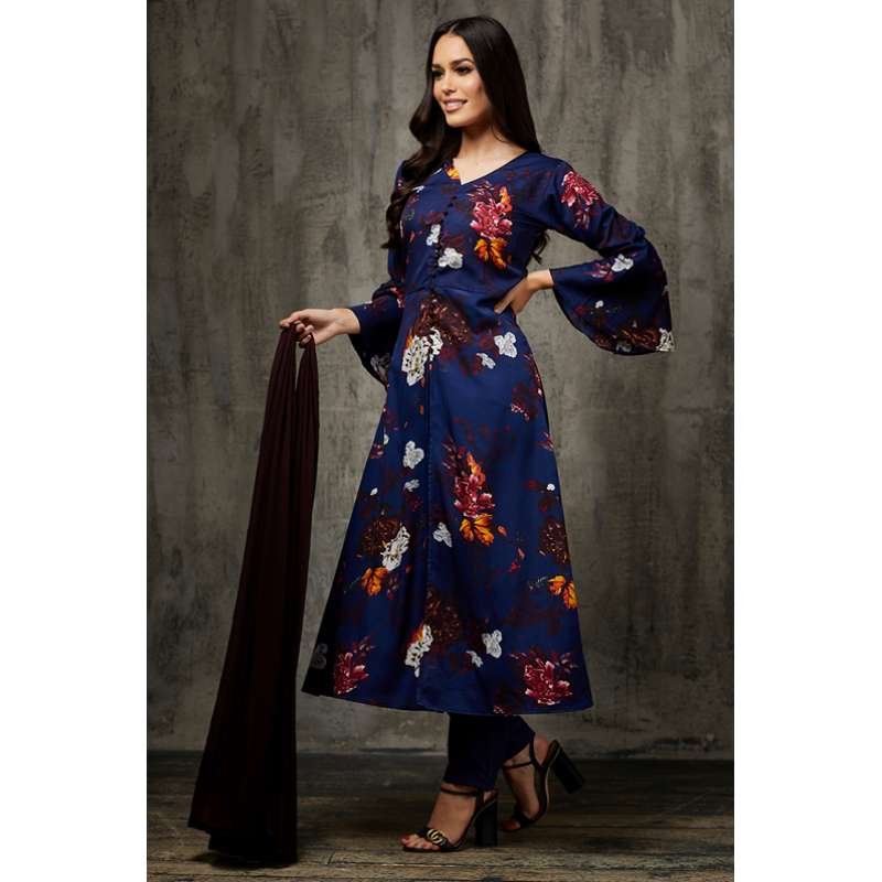 An incredible front slit floral print suit with bell sleeves and buttons on the front is paired with contrasting pencil trousers and dupatta that looks striking enough for a fab look.