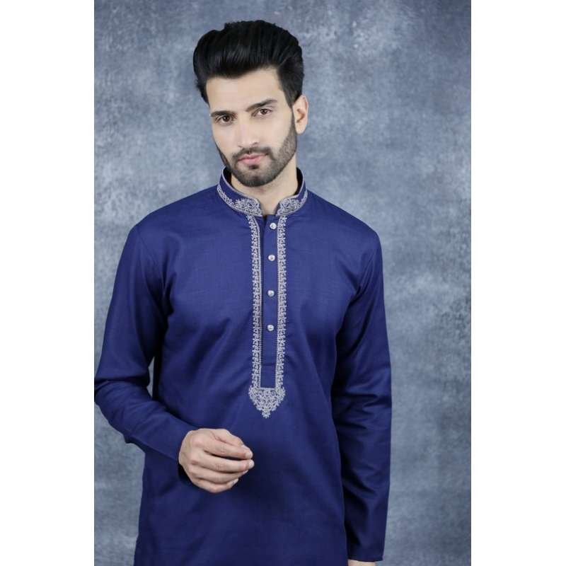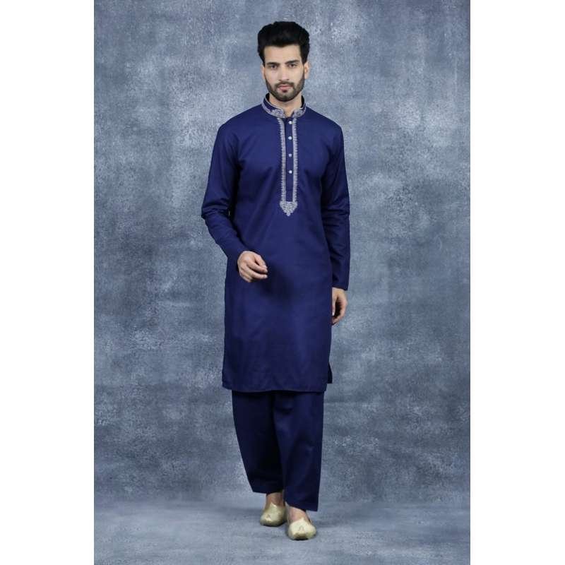 Crafted from Polyester, this piece features an embroidered band collar with silver colored buttons. It comes in grey and navy blue and is paired with the same colored salwar.