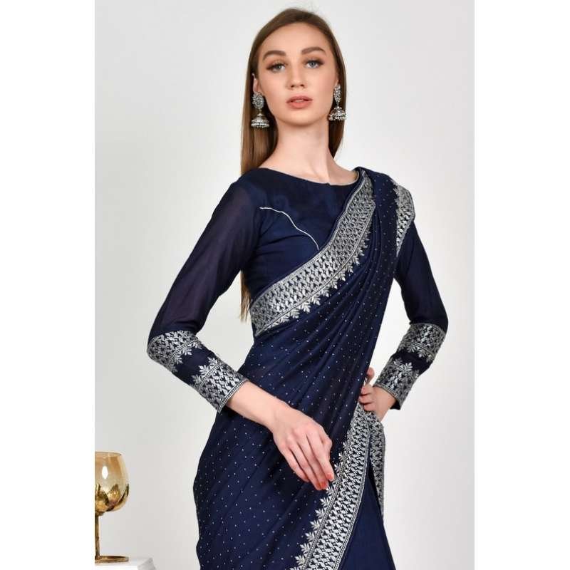 Beautiful vachitra fabric saree with allover stone work edges designed with heavy embroidered border. It is paired with same color blouse with border on sleeves.